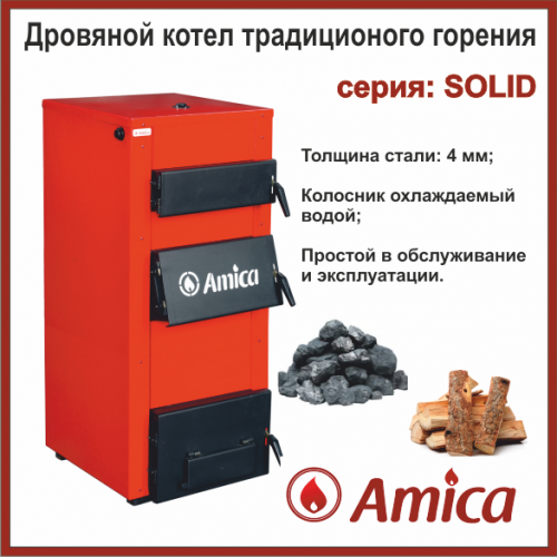 Твердопаливні котли аміка працюють на будь-яких дровах, кам'яному вугіллі або паливних брикетах. Базово управління даного апарату механічне, але за бажанням покупця, його можна автоматизувати. Автоматичне підтримання температури складається з блоку керування та вентилятора. Товщина корпусу теплообмінника складає 4мм.