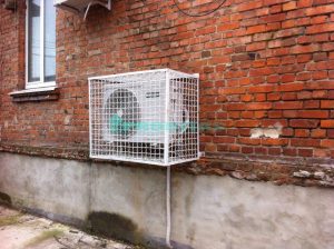 - Подготовка и крепление козырьков и антивандальной сетки. Первые применяются в тех случаях кода в месте монтажа, ввиду проблем с отливами, постоянно льется вода с крыши или есть опасность падения сосулек и других опасных предметов. Установка решеток необходима когда кондиционер находится низко над землей, и есть вероятность его порчи вандалами.